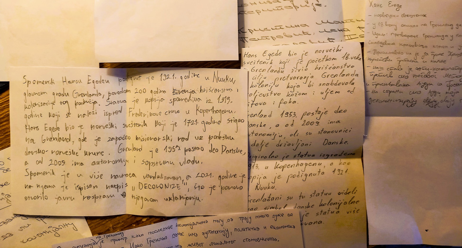 When students saw the photographs of the Egede statue doused in red paint, they immediately recognized the parallel with the recent event in Belgrade, where the statue of Gavrilo Princip had been similarly defaced that same weekend. This served as a starting point for discussion on monuments in public spaces and how they provoke contestation among different social groups.